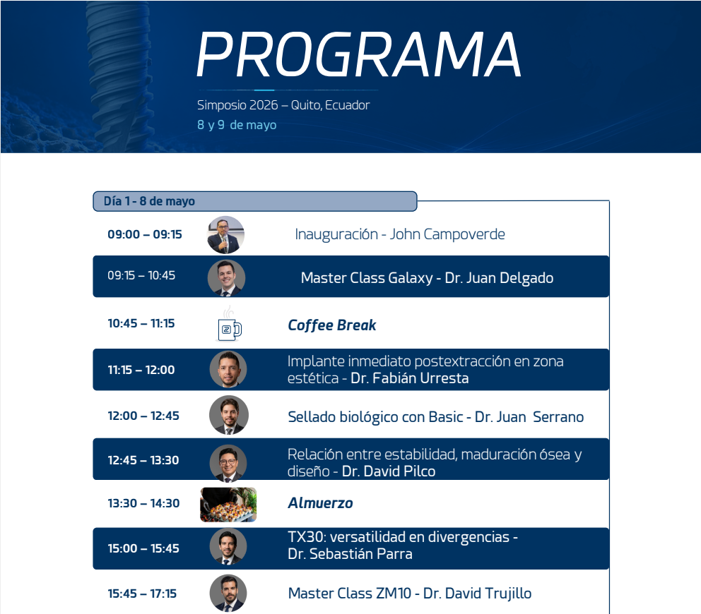 Nos complace anunciar la próxima celebración del Simposio Ziacom Ecuador, un encuentro diseñado para reunir a profesionales de la odontología que buscan seguir avanzando en implantología, cirugía guiada, rehabilitación oral y estética funcional.